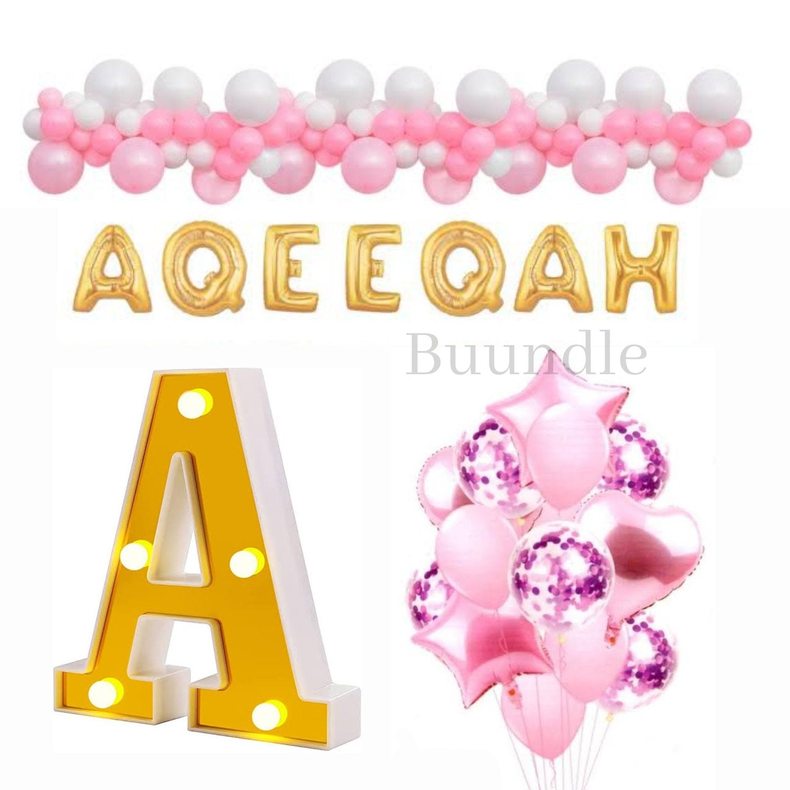 ⭐Aqeeqah golden foil balloon⭐ 2 pink heart foil balloon⭐2 pink Star foil balloon⭐ 5pc pink confetti balloons⭐50 pink latex balloons⭐ 50 white latex balloons⭐golden led letter