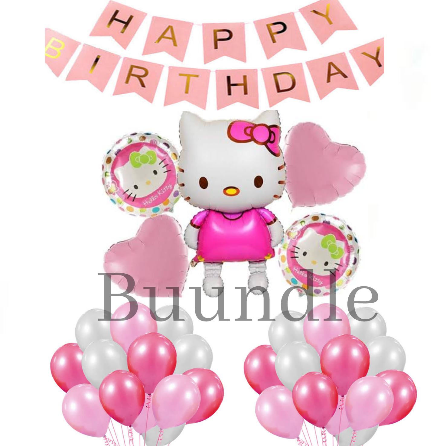 Happy birthday Pink banner, 5pc hello kitty foil balloon, 20 light pink latex balloons, 20 dark pink latex balloons, 10 white latex balloons