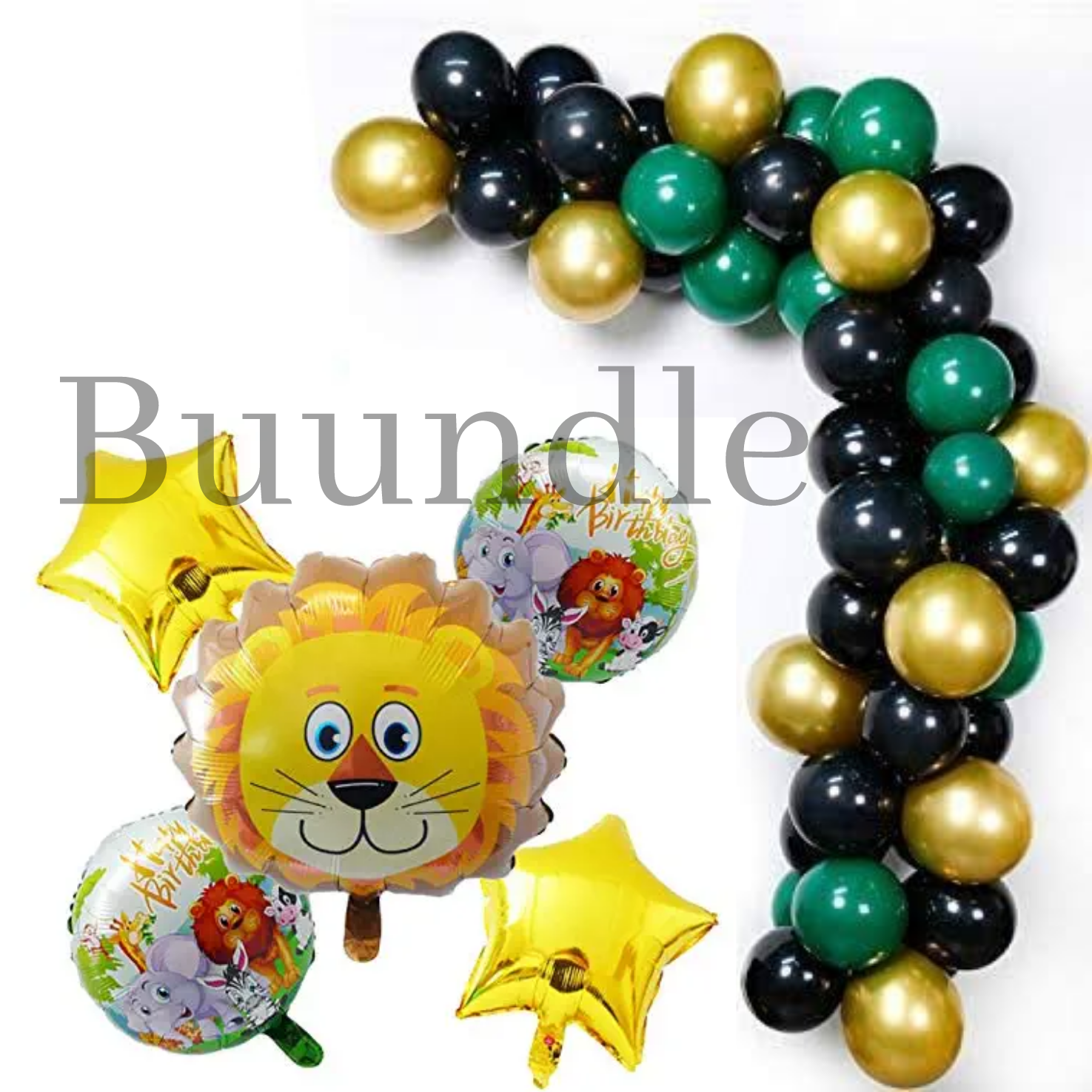 5pc lion foil balloon, 10 golden chrome balloons, 20 dark green latex balloons, 20 black latex balloons